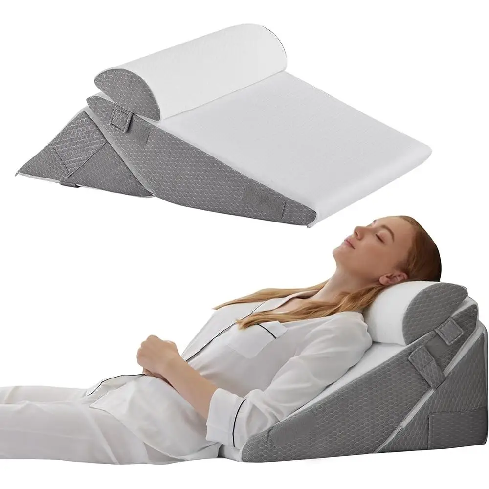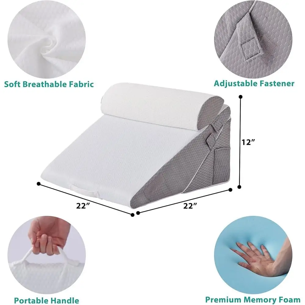 About this item Adjustable 10-in-1 Design: Bedluxe’s bed wedge pillow set offers a dynamic 10-in-1 adjustable design. Its ergonomic design supports various uses – from elevated back support for sleeping, reading or working, to a gentle slope for sleep, easing snoring, post-surgery discomfort, acid reflux, and improving blood circulation as a leg elevation pillow. Enhanced Health Support: Designed for improved blood flow, breathing, and reduced snoring, the ergonomic wedge pillow system aid recovery post-surgery, alleviate knee, back and leg pain. Premium Memory Foam: Our dual-layer design combines breathable memory foam atop a supportive base, ensuring a customized, pressure-relieving sleep that outperforms other wedges. The post-surgery wedge pillows conform to your body’s curves, providing superior comfort and pressure relief, while maintaining its shape and support over time. Easy Care and Portability: Benefit from a convenient foldable design, allowing for hassle-free storage and travel, along with a machine-washable cover that maintains its softness and aesthetics. Multi-Functional Design: Elevate your sleep quality with a 3-piece pillow wedge set including a bottom triangle support cushion, a triangle cushion and half-moon bolster pillow, catering to different needs such as head, neck, lumbar, knee, and ankle support. Warm Tips: To ensure optimal performance and comfort, allow the triangle pillow wedge set to naturally expand in a well-ventilated area for 12-24 hours upon receipt. Expansion time may vary, patience for 24-48 hours ensures full support. Maintain cleanliness by regularly washing the removable cover. Please remember to peel off the protective layer covering the Velcro before use.